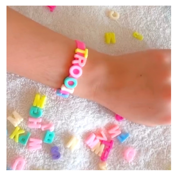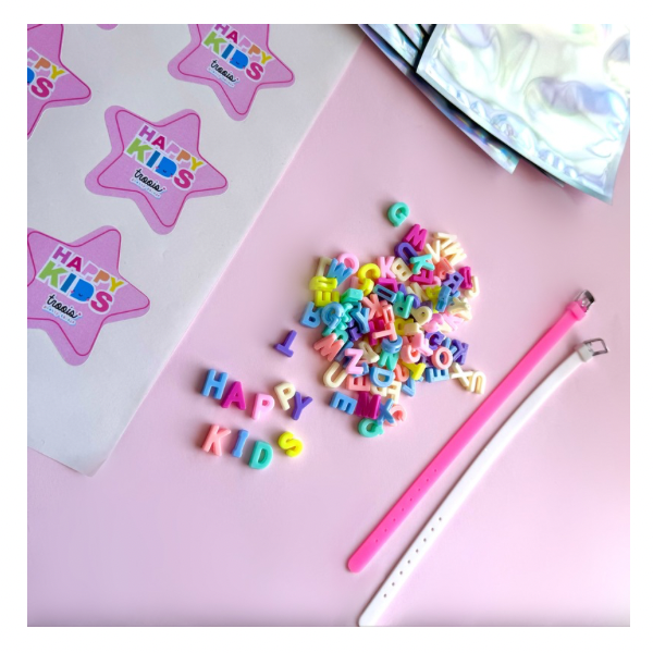PUEDES ESCOGER EL COLOR DE LA PULSERA ROSA O BLANCO, LAS LETRAS SON TODAS DE COLORES DIFERENTES.