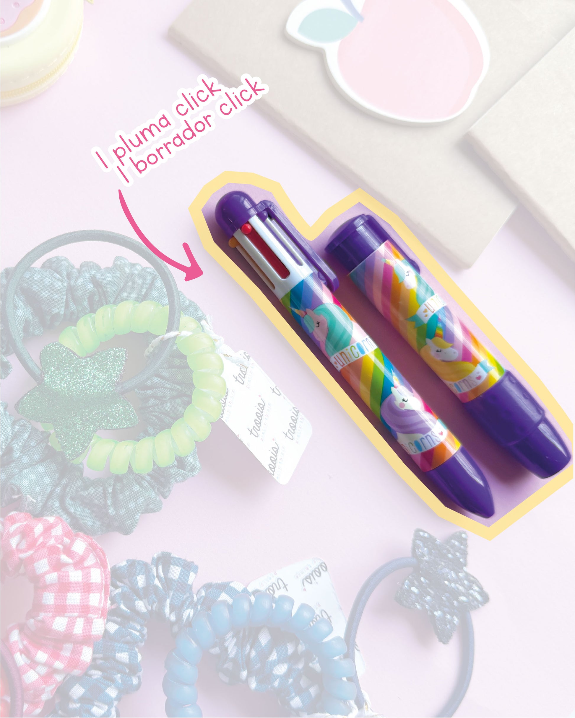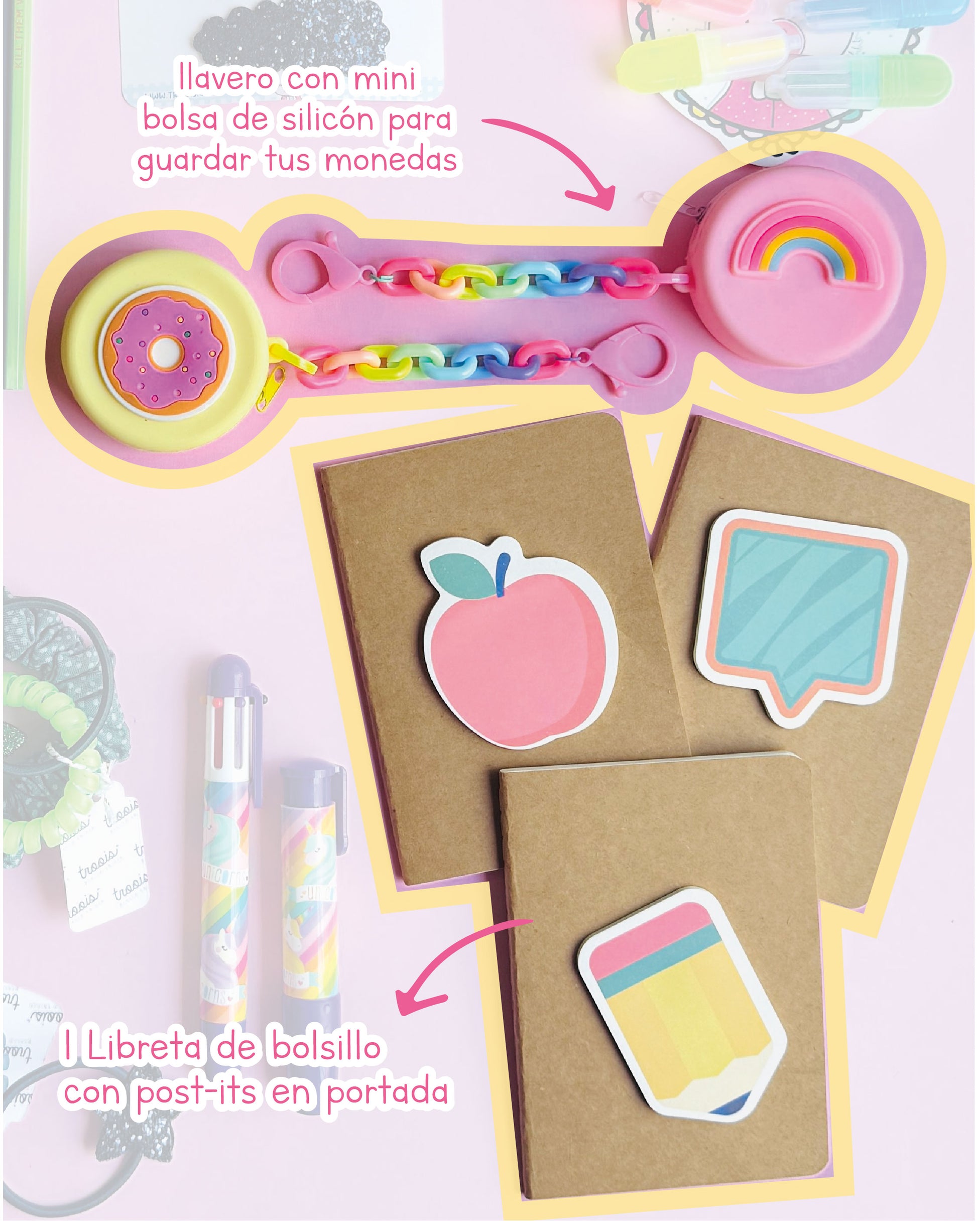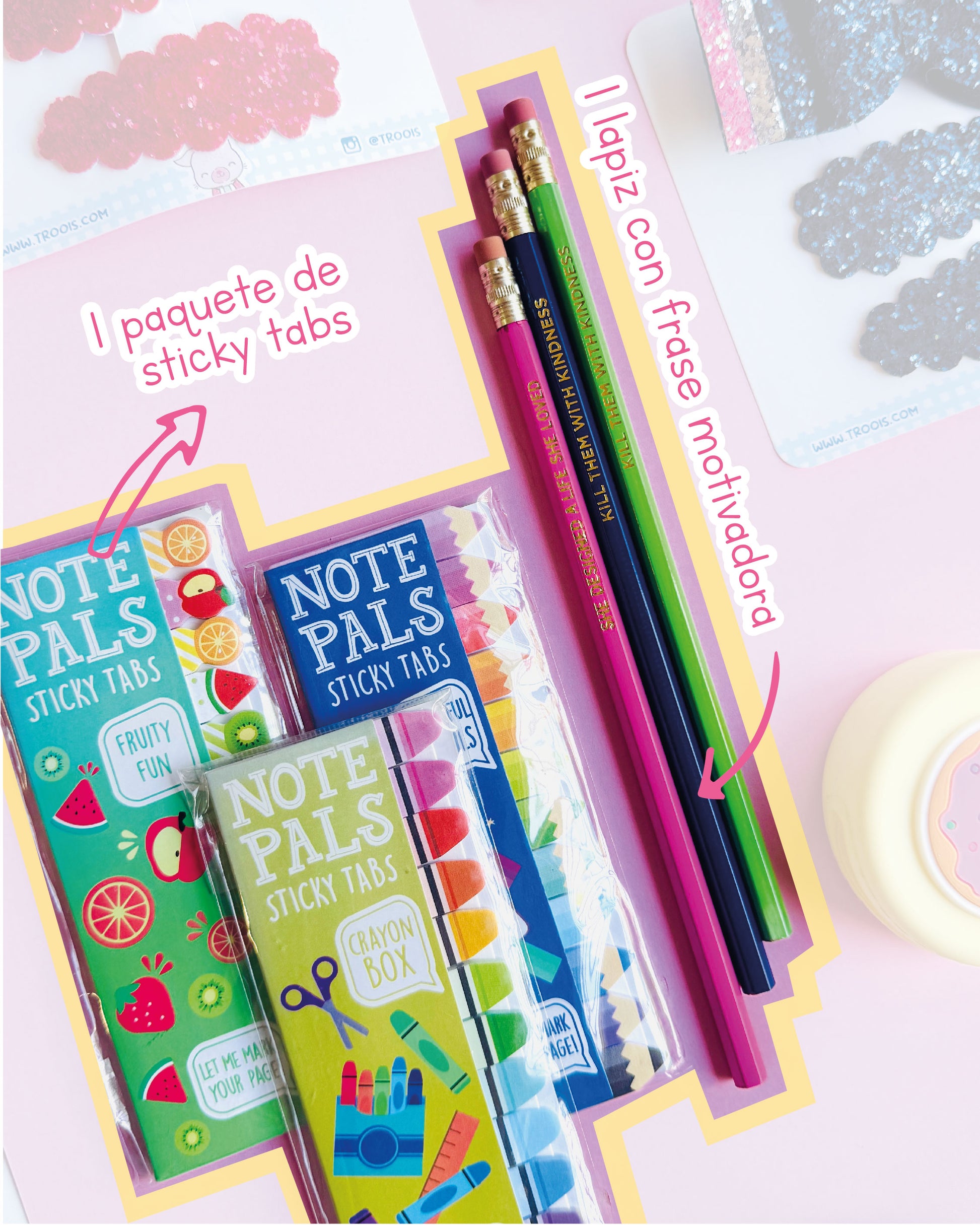 CADA MALETA INCLUYE: 1 LIBRETA DE BOLSILLO CON POST-iT EN LA PORTADA (manzana, lápiz o pizarrón), 1 LLAVERO CON BOLSITA, 1 PAQUETE DE STICKY TABS, 6 MINI HIGHLIGHTERS, 1 LÁPIZ, 1 PLUMA CLICK, 1 BORRADOR CLICK, 1 PULSERA AJUSTABLE, 1 SET DE BROCHES (1 forma de lápiz y 2 cucas) y 1 SET DE 3 LIGUITAS.