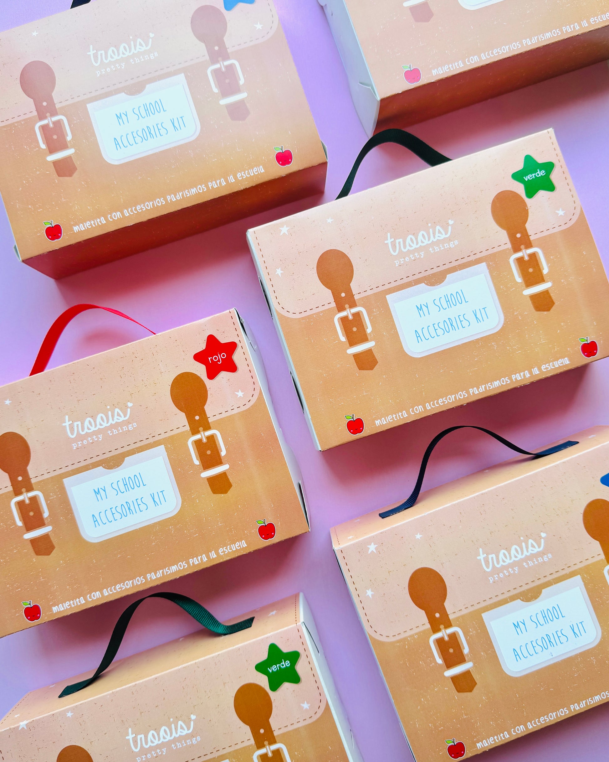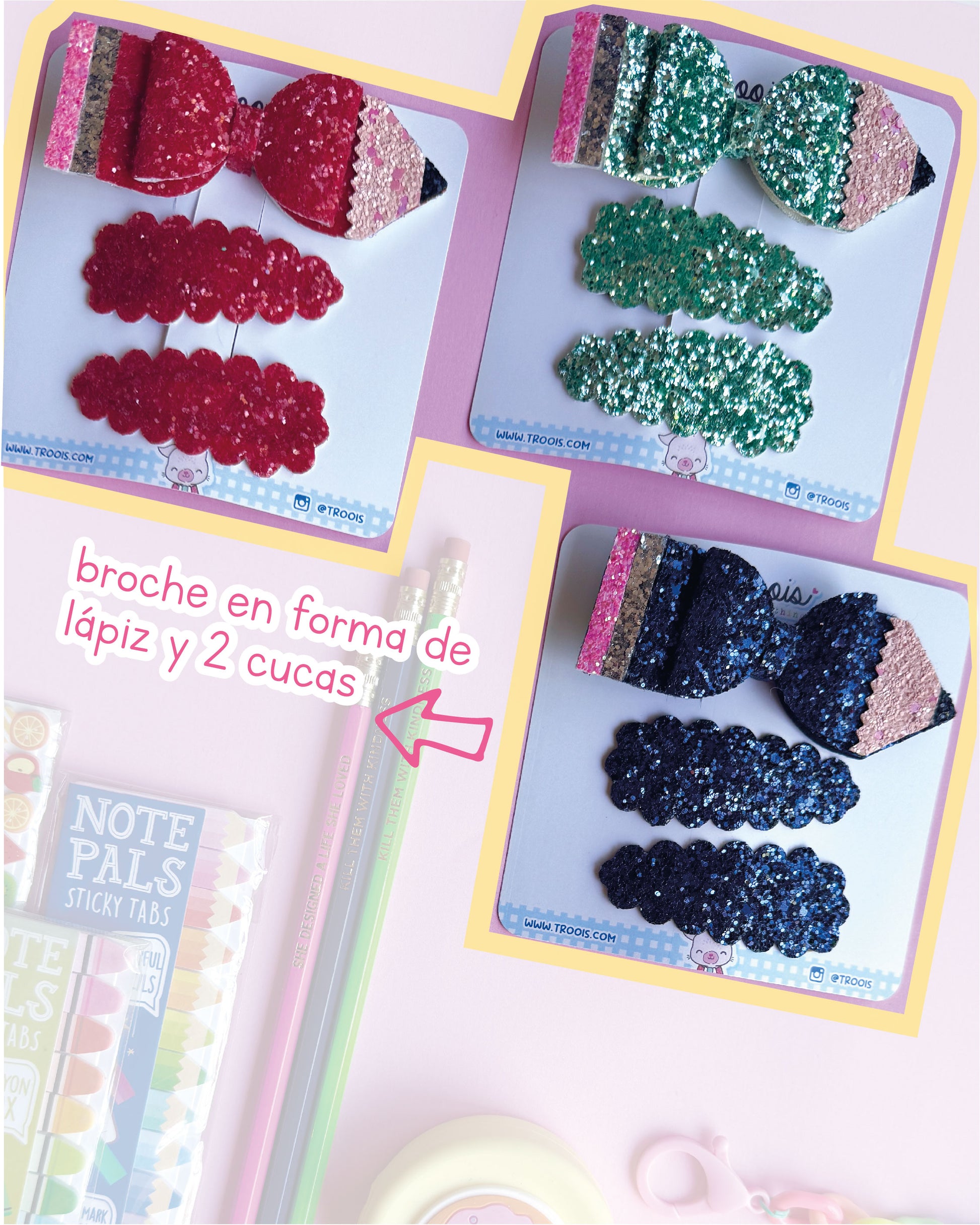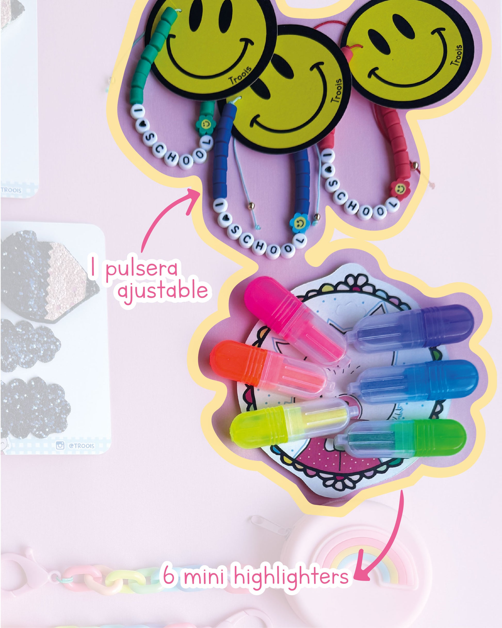 CADA MALETA INCLUYE: 1 LIBRETA DE BOLSILLO CON POST-iT EN LA PORTADA (manzana, lápiz o pizarrón), 1 LLAVERO CON BOLSITA, 1 PAQUETE DE STICKY TABS, 6 MINI HIGHLIGHTERS, 1 LÁPIZ, 1 PLUMA CLICK, 1 BORRADOR CLICK, 1 PULSERA AJUSTABLE, 1 SET DE BROCHES (1 forma de lápiz y 2 cucas) y 1 SET DE 3 LIGUITAS.