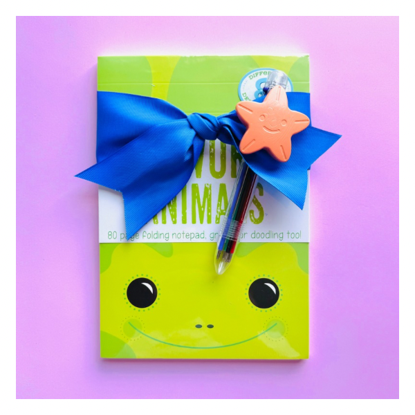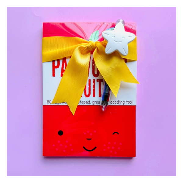 ESTE KIT INCLUYE 1 LIBRETA DE 80 HOJAS CON 8 DISEÑOS DIFERENTES DE HOJAS, 1 PLUMA DE CLICK Y 1 CRAYOLA EN FORMA DE ESTRELLA.