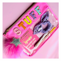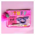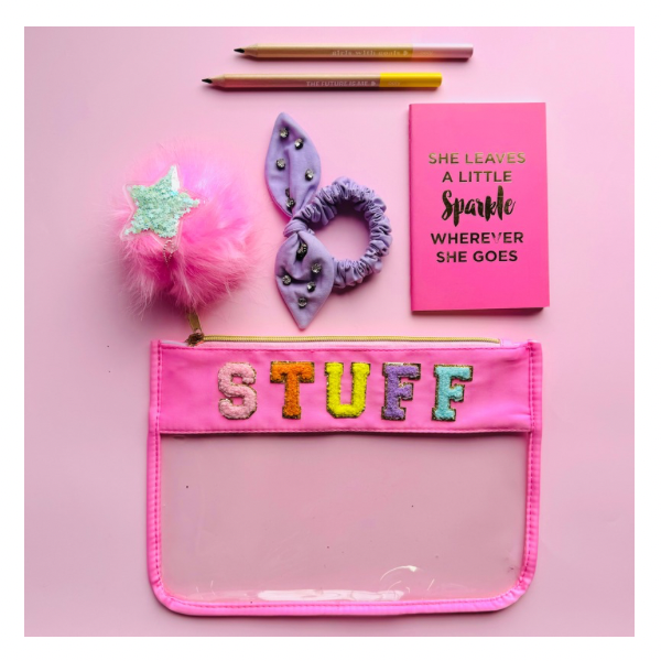 BOLSA CLEAR DE VINIL CON PARCHES QUE FORMAN LA PALABRA "STUFF" INCLUYE: 1 LIBRETA, 1 SCRUNCHIE, 2 LAPICES MOTIVACIONALES Y 1 LLAVERO CHUNKY.